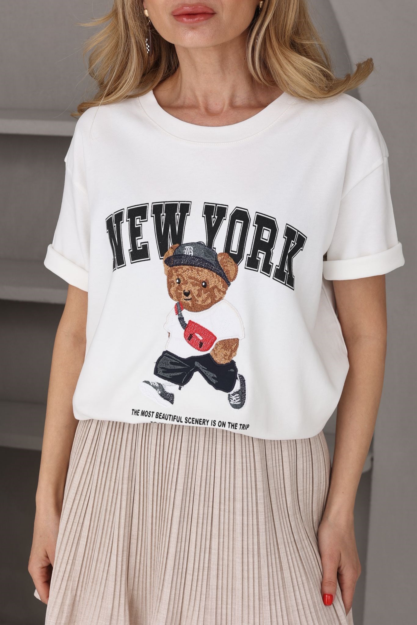 Ekru Teddy Nakışlı Basic Tshirt (TSH000767)
