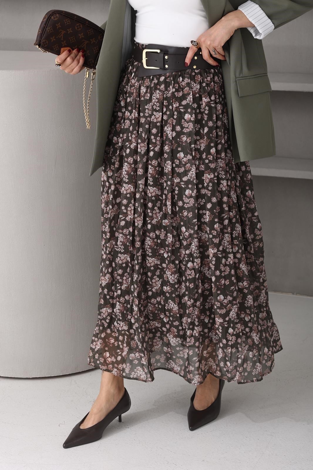 Haki Çiçekli Kemerli Şifon Etek (ETK000606)