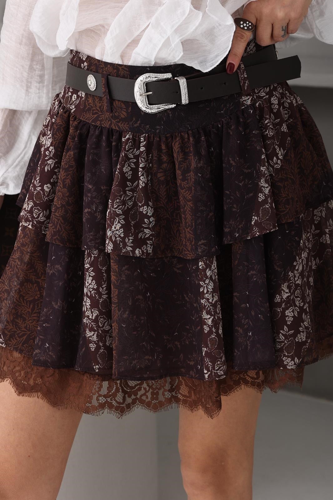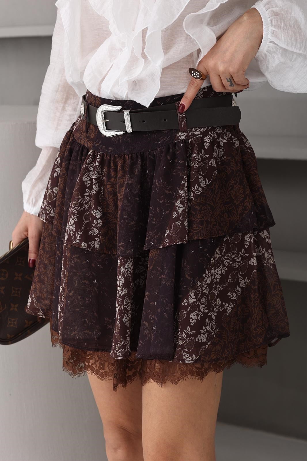 Kahve Çiçek Desen Mİni Katlı Şifon Etek (ETK000616)
