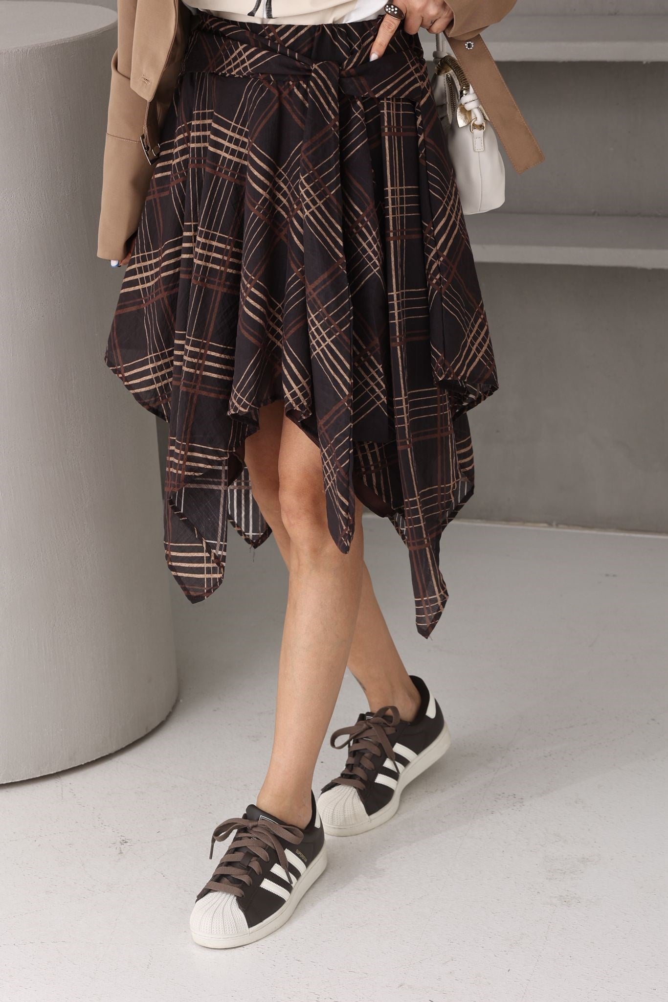 Kahve Ekoseli Asimetrik Mini Şifon Etek (ETK000627)