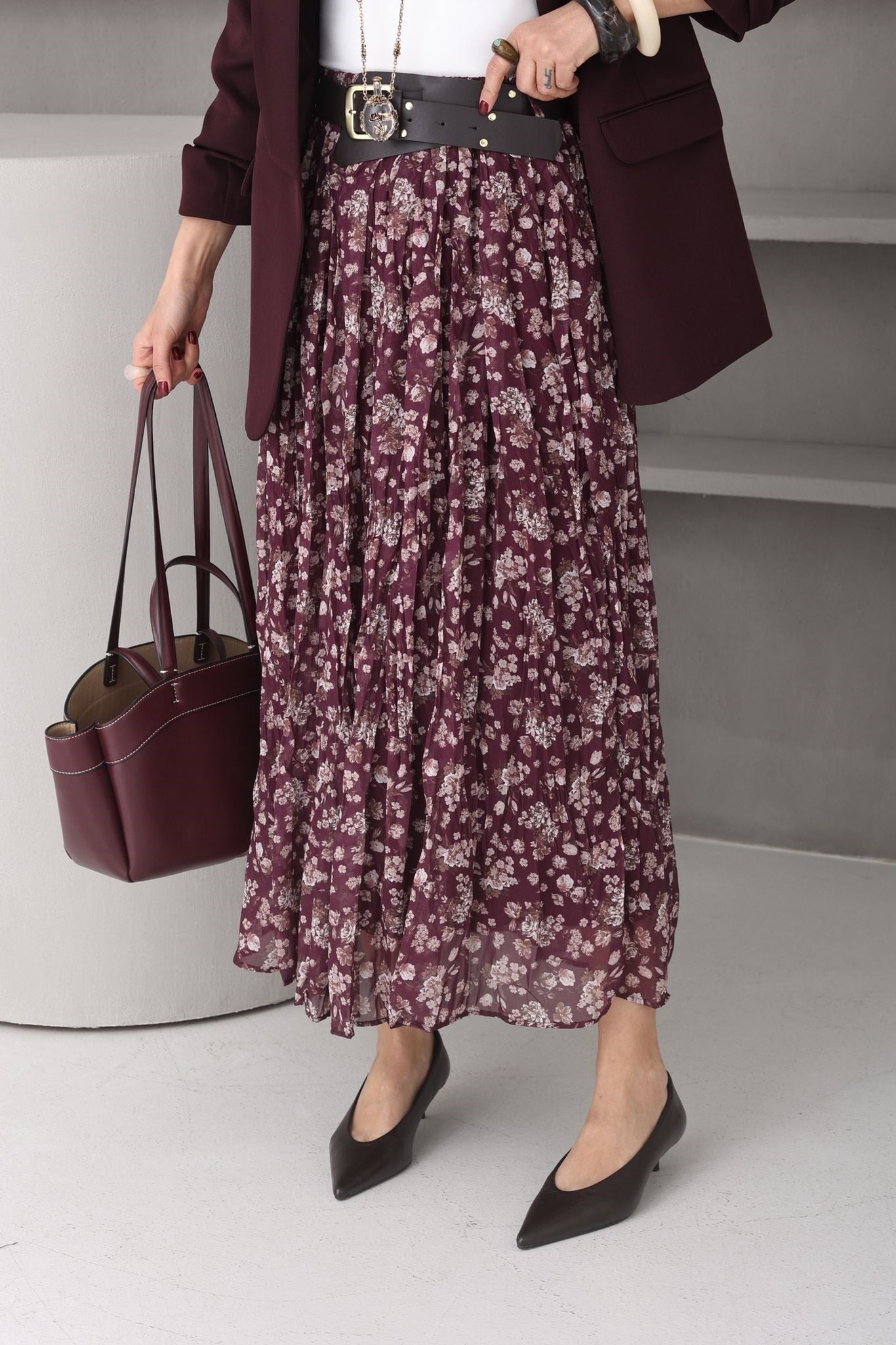 Mürdüm Çiçekli Kemerli Şifon Etek (ETK000607)