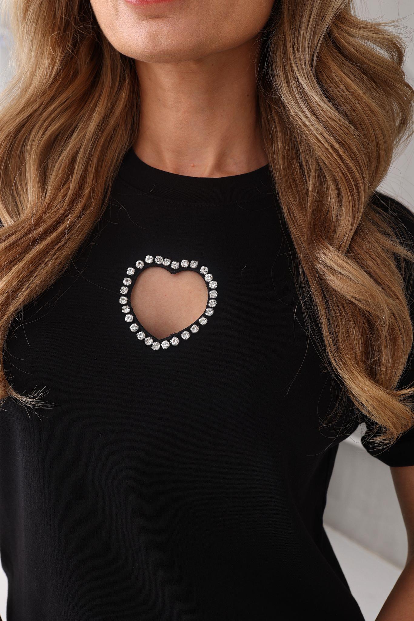 Taş işli Kalp Detay Siyah Tshirt (TSH000745)